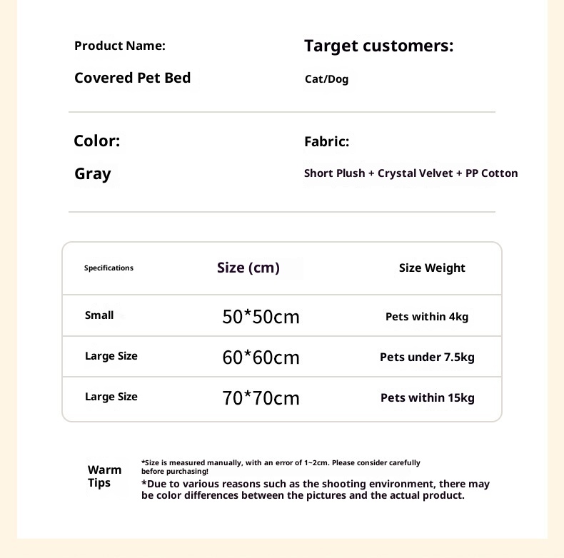 Product information:Color: 50cm (diameter),60cm (diameter),70cm (diameter)Specification: dark gray (universal for all seasons)Applicable occasions for gifts: wedding, party gathering, othersMaterial: clothApplicable gift-giving relationships: couples, couples, colleagues, friends, children, classmates, othersApplicable holiday: Christmas, Valentine's Day, Spring Festival, Chinese Valentine's Day, Halloween, Easter, National Day, Children's DayApplicable object: CatCategory: pet bed, CagePacking list:...