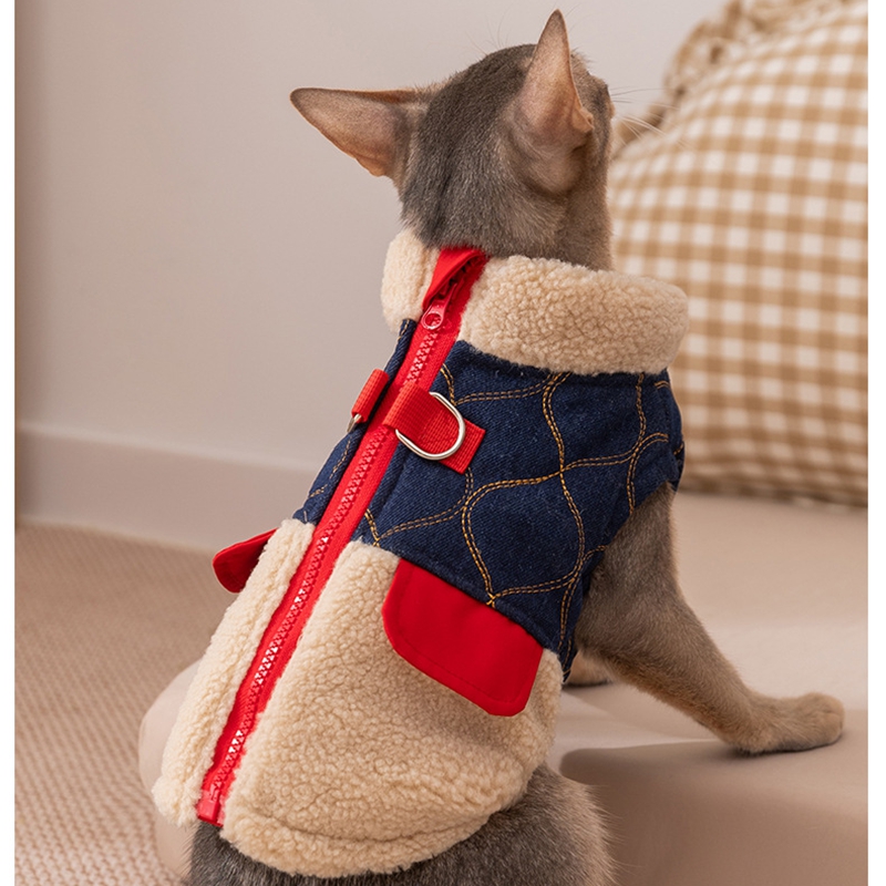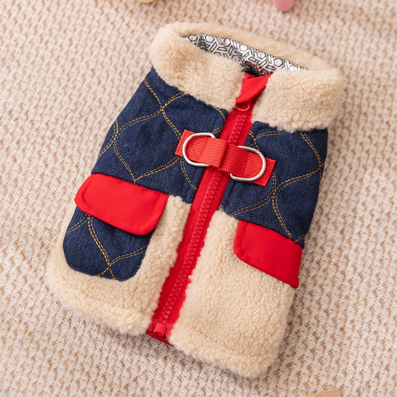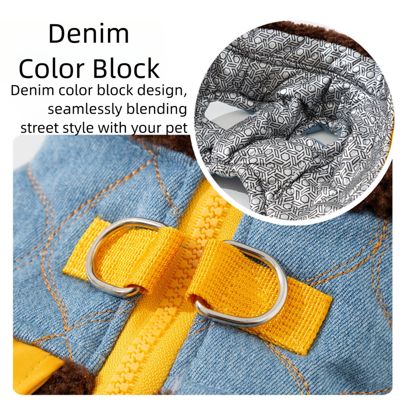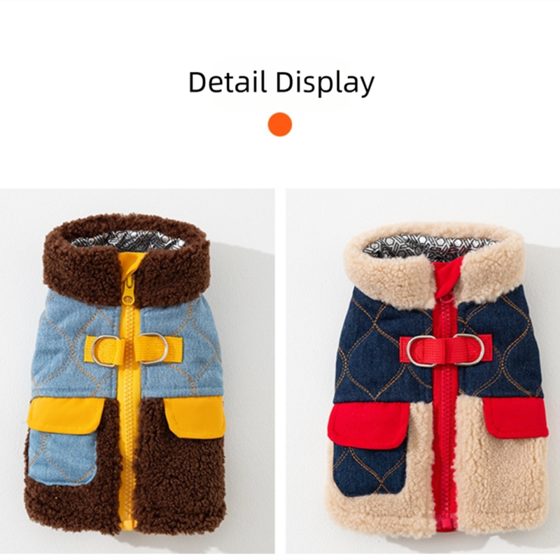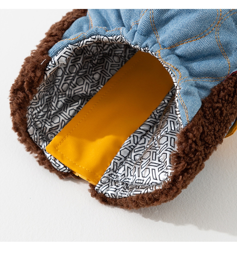 Product Description- Warm and durable fabric: Quilted denim (waterproof and long-lasting) paired with soft Sherpa lining + trim (very comfortable in cold weather).- Fashionable design details: Bold color blocks (navy blue/red or light blue/yellow) + a functional D-ring belt (for belt connection) + zipper closure (easy to put on/take off).-...